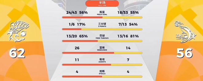 回来后,对手在洛夫顿这个点上仍然没能找到有效的应对办法,好在两位外援进攻欲望强烈,始终没被大鲨鱼落下太多。上半场最后时刻,“小胖”继续发力,持球攻至篮下强起打进2+1!上半场比赛结束,大鲨鱼62-56福建男篮,洛夫顿个人数据亮眼:21分5篮板2助攻2抢断。