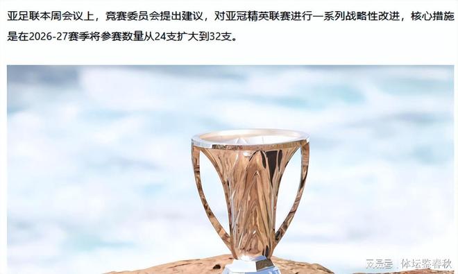 近日,多家国内外媒体报道,亚足联竞赛委员会提出了对亚冠精英联赛进行结构性调整的可能性,从2026-27赛季开始扩军至32支球队。东亚和西亚继续分区,分别有16支球队参赛,这个改革动议,让不少俱乐部开始重新计算自己的位置。