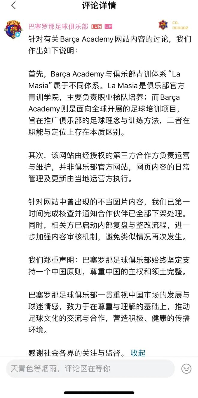 今天(4月21日)晚上,针对Barça Academy网站出现不当图片内容,巴塞罗那足球俱乐部(昵称“巴萨”)在其B站官方账号动态评论区中发文回应。