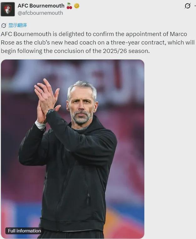 官方:伯恩茅斯宣布任命马尔科-罗泽为主帅,双方签下了一份3年合同,本赛季结束之后生效。