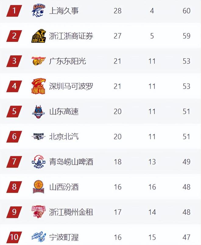 上海、广厦继续领跑前二,上海赛季三杀山西,目前来到了13连胜,联赛一枝独秀,目前上海阵容齐整,团队磨合也来到了一个新的层次,内线有护框巨兽,锋线有2位国手,外线也持球点众多,并且可怕的是上海队人人都有三分。