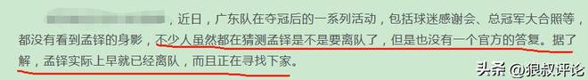 当时有媒体报道,孟铎以私人原因离开球队,随后剩下的常规赛,季后赛都没有再出现在广东男篮阵容名单。