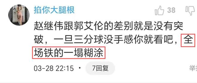 上场与吉林队的比赛,赵继伟更是疯狂浪投,14次出手仅打中一球,29分钟仅得3分,赛后遭到乌戈暗批:命中率太低。最近两场赵继伟一共21次出手,只打中2球,命中率不够一成,这样的表现与赵继伟的名气和身价毫不相配,球迷说,赵继伟跟郭艾伦的差别就是没有突破,一旦三分球没手感你就看吧,全场铁的一塌糊涂。
