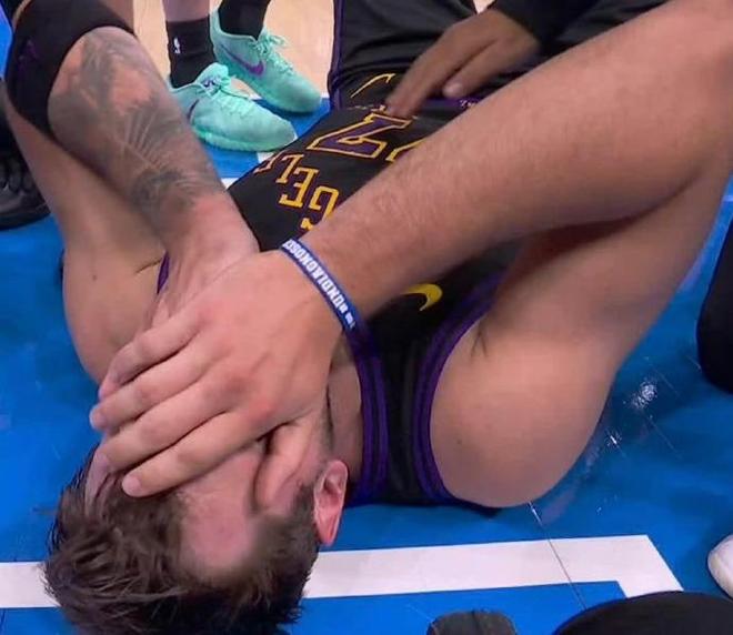 4月3日结束的NBA常规赛中,湖人客场以96-139惨败雷霆。比赛第三节,东契奇在一次突破中无对抗的情况下受伤倒地,随后双手掩面非常痛苦。
