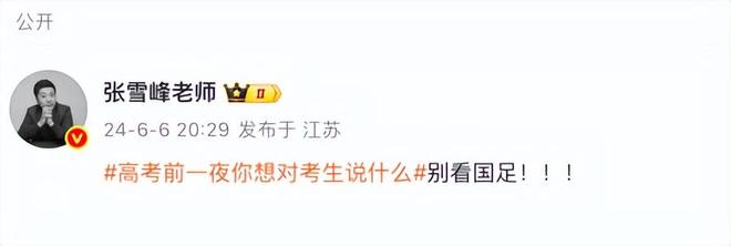 2024年高考前夜,张雪峰参与话题讨论“高考前一夜你想对考生说什么”,他的答案是四个字——“别看国足”。