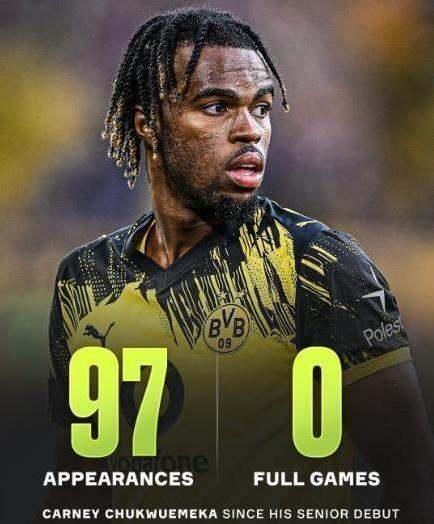 回顾丘库埃梅卡的职业生涯,到目前为止有一个诡异的数据,困扰着这位新晋奥地利国脚。那就是丘库埃梅卡出战97场正式比赛,居然到现在还是尴尬的0次踢满全场。这是一个极其罕见的数据,无论首发还是替补,无论比赛是领先还是落后,无论教练是图赫尔、波切蒂诺还是如今多特蒙德的教练组,他似乎总会在终场哨响前离开球场。