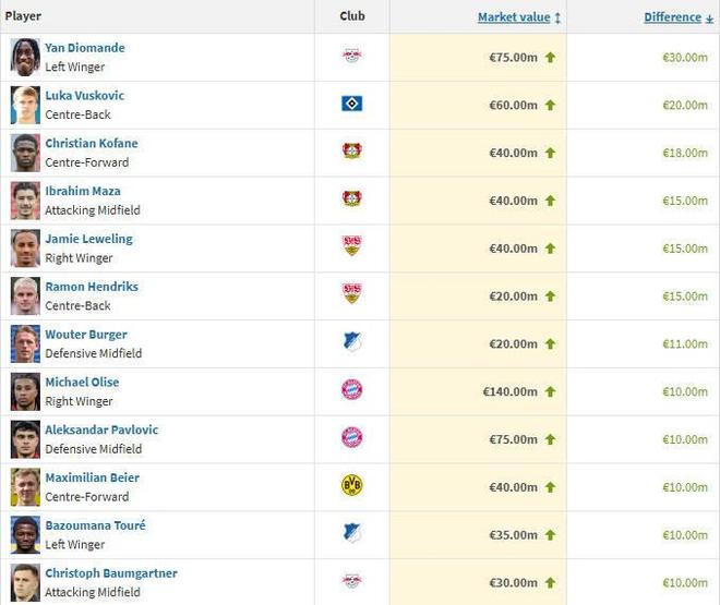 德甲球员身价涨幅榜TOP10: