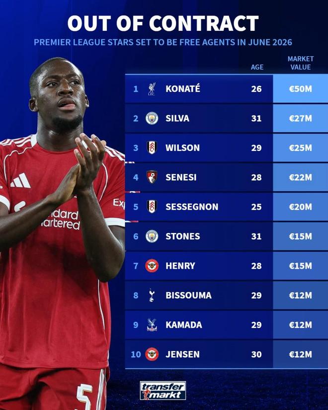 北京时间3月30日,德转列出了英超现有合同6月到期球员的身价榜,利物浦中卫科纳特以5000万欧元高居第一,曼城的伯纳多-席尔瓦和斯通斯上榜。