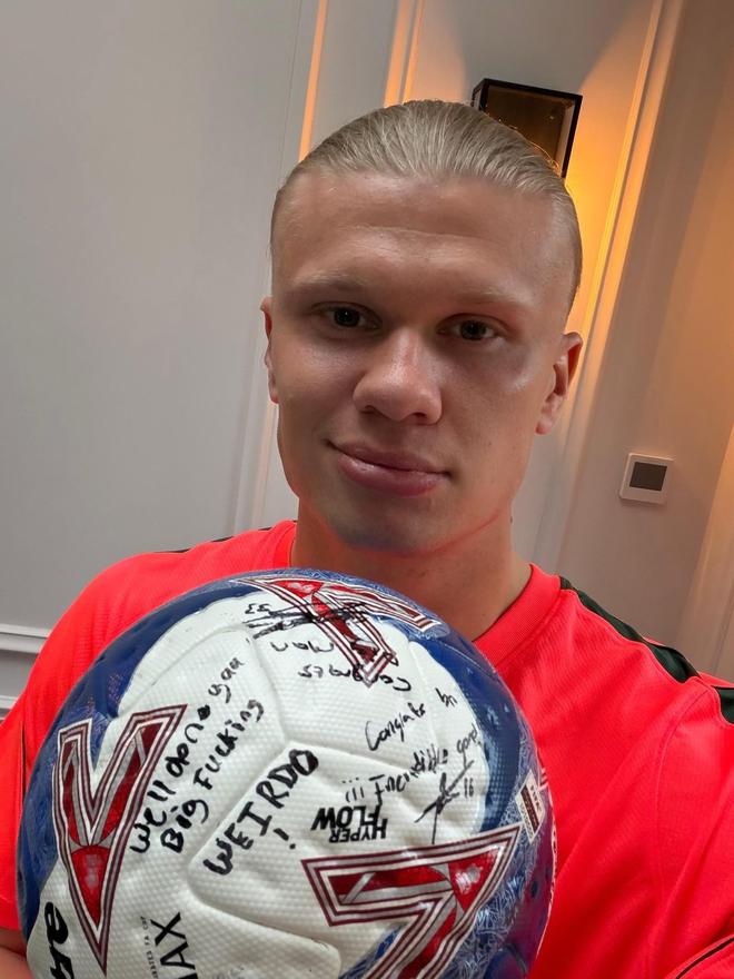 赛后,哈兰德在社交媒体晒出一张他手里拿着比赛用球的照片,球上有队友们的签名和祝福,哈兰德配文:“不错的周六!! ”