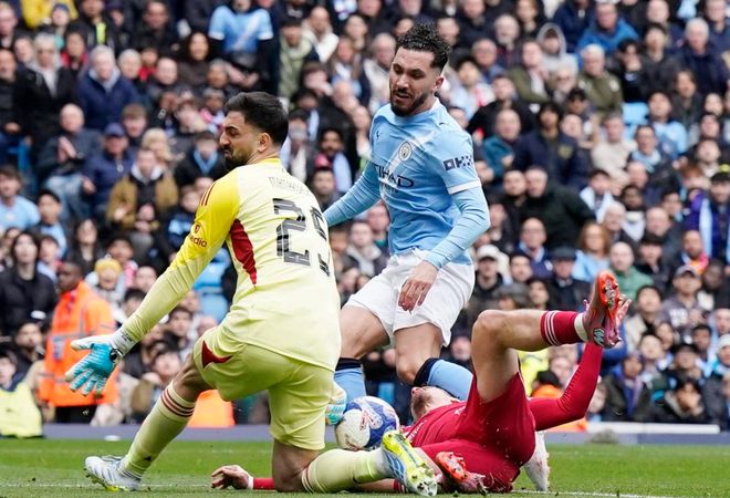 第27分钟,埃基蒂克禁区内的劲射踢高了。他捂脸不敢相信。第34分钟,罗德里犯规被出示黄牌。3分钟后,范戴克禁区内踢倒奥赖利。裁判判罚点球。哈兰德主罚,他骗过门将,稳稳把球罚进。曼城取得领先!半场补时阶段,曼城再次进球。塞门约在右侧起球传中,哈兰德头球顶进,梅开二度!半场结束,曼城2-0领先利物浦。